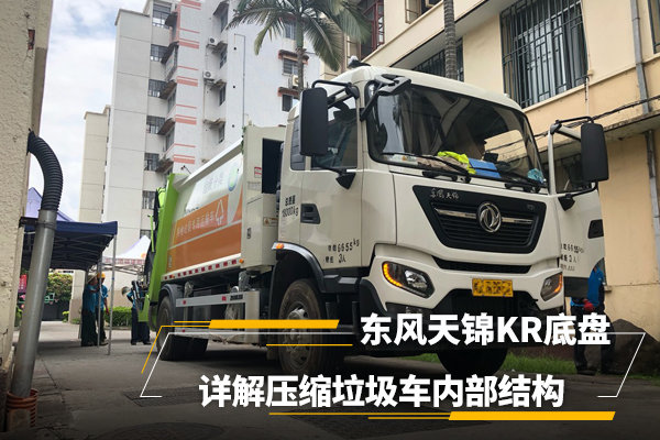 这辆压缩式垃圾车来自天锦KR载货车底盘,发动机有东风、东风康明斯、福田康明斯可选择。