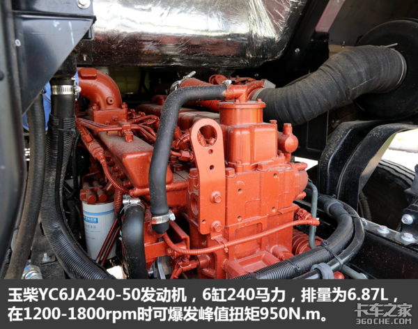 如若要探讨其时效性和可靠性,底盘配置是重中之重,针对绿通用户时效性的要求,首先发动机得有足够的储备动力,这款江淮格尔发A5X Ⅲ搭载的是玉柴YC6JA240-50发动机,6缸240马力,排量为6.87L,在1200-1800rpm时可爆发峰值扭矩950N.m。