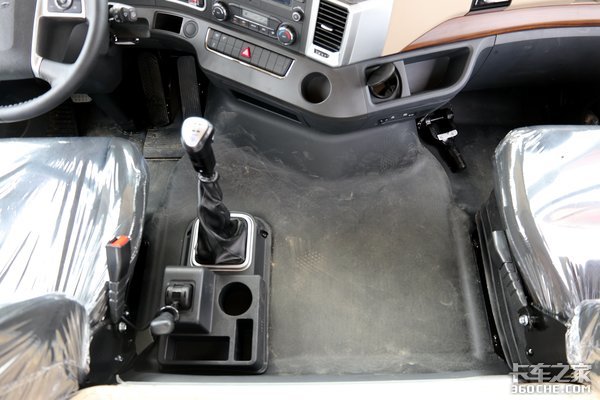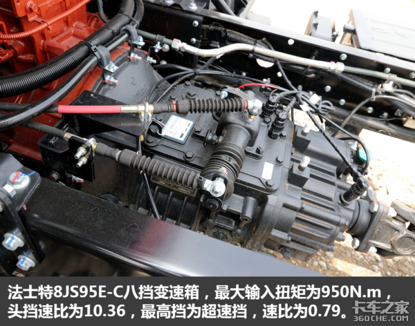 与之匹配的变速箱为法士特8JS95E-C八挡变速箱,最大输入扭矩为950N.m,头挡速比为10.36,最高挡为超速挡,速比为0.79,这款变速箱在目前国内的中卡市场中装机率非常高。另外也可选装重汽HW90510C 10挡变速箱。