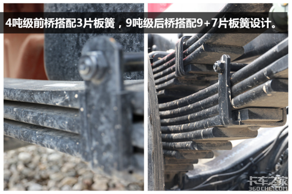4吨级前桥搭配3片板簧,9吨级后桥搭配9+7片板簧设计,针对不同工况的用户也有四种速比可供选择,分别是3.909、4.111、4.333、4.875。