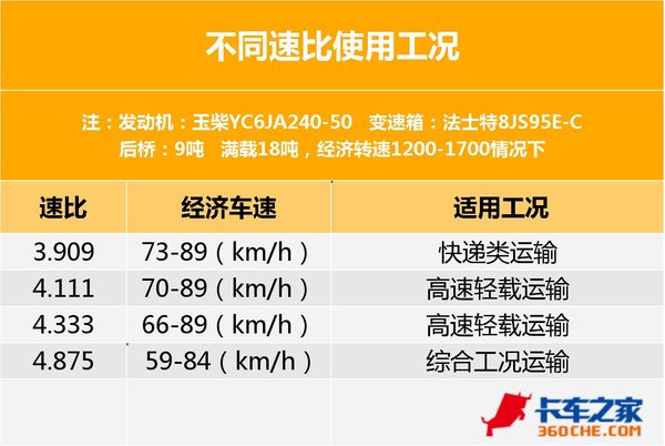 这样针对性的搭配设计既可以保证车辆在巡航时速下的整体燃油经济性,又能保障车辆在不同工况下都能够有充足的动力输出。另外,江淮官方也给出了不同后桥速比所对应的经济车速、适用工况的参考,大家可以根据自己的细分市场以及工况来进行选择。