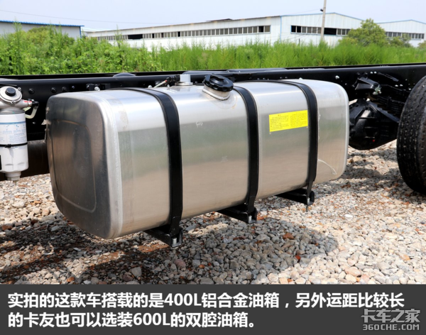 实拍的这款车搭载的是400L铝合金油箱,另外运距比较长的卡友也可以选装600L的双腔油箱。双腔油箱可以加不同标号的柴油,节省燃油成本。