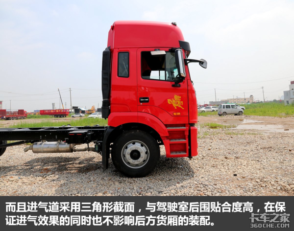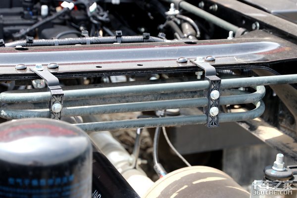 而且进气道采用三角形截面,与驾驶室后围贴合度高,这样在保证进气效果的同时,也不影响后方货厢的装配。空滤器安装在驾驶室的下方,更加牢靠,避免了风吹日晒,也可以更好的提升空滤的密封性能。