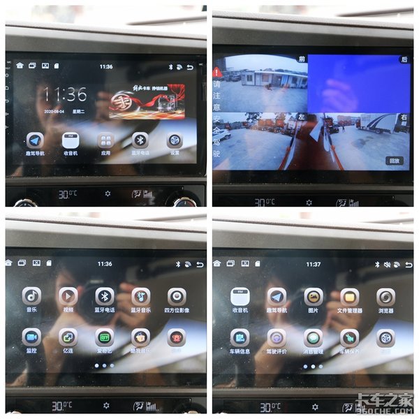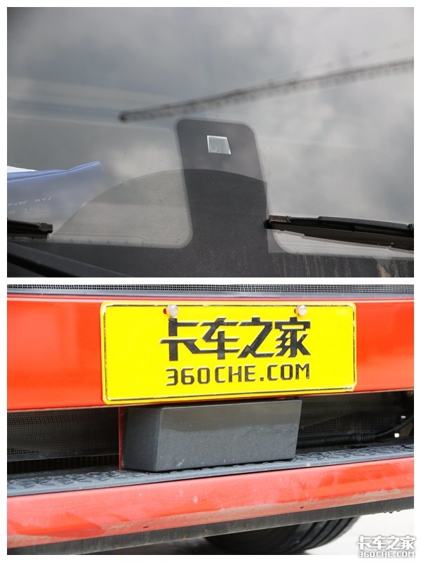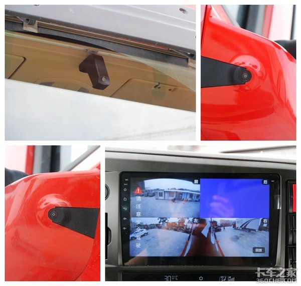 四方位影像系统的摄像头,现车已经安装三个(另一个在挂车上安装),分别布置在前挡风上部,和两侧后视镜下方。广角镜头,清晰度尚可。驾驶员可以在新增的10英寸大屏上,查看车辆周围环境,减少事故发生。该系统还支持“回放”功能,起到行车记录作用。