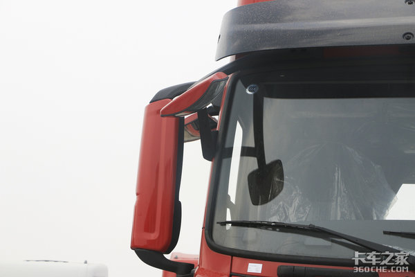 后视镜采用重卡上常见的一体式设计,整洁美观,尺寸也比较合适,能够提供宽阔的后方视野,该车后视镜外壳还采用了与车身一致的红色涂装,增加了整体美观度。并且该车后视镜带有电动调节和电加热功能,实用性同样也很给力。