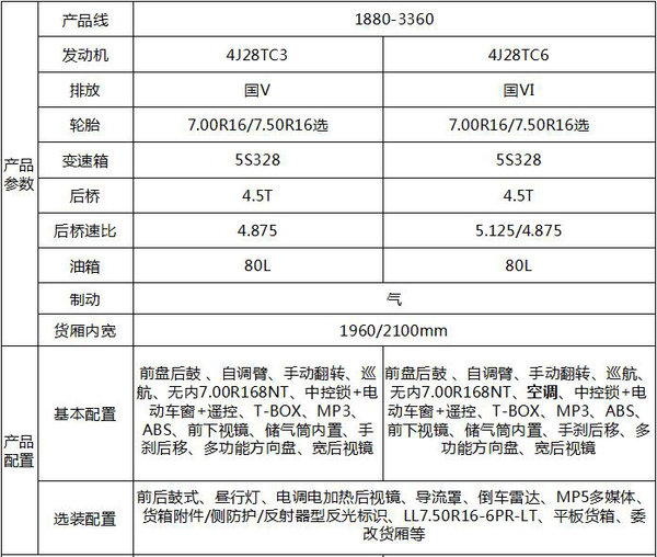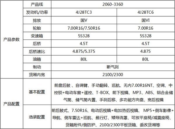 搭载4J28系列五十铃技术发动机,2.77升排量。国五版本(4J28TC3)最大功率110马力,峰值扭矩280牛米;国六版本(4J28TC6)最大功率120马力,峰值扭矩324牛米。这是目前唯一在售,搭载五十铃4JB1技术国六发动机的轻卡,保养间隔为2万公里,官方还提供5年55万公里质保。