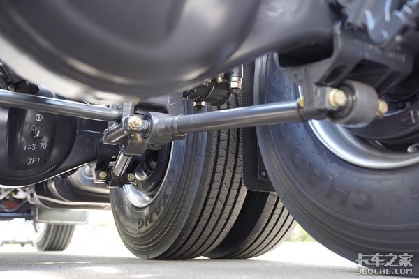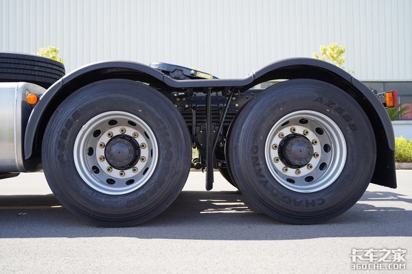轮胎是装配了12R22.5型号的朝阳牌真空胎,其特点就是耐用和省油,可以节约成本支出。还可选装康迈50万公里免维护轮端,流动性更好,使用寿命更长。