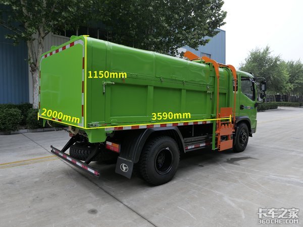 这台风驰1800垃圾清运车上装长宽高分别为3590x2000x1150,容积达到8立方米。