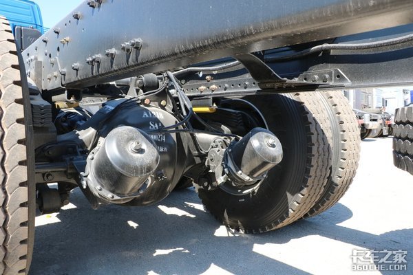 这款车后桥允许载荷18000(二轴组)KG,495后桥,速比为3.7。悬架的板簧采用3/3/5的形式,在动力良好的情况下,还能保证一定的承载能力。