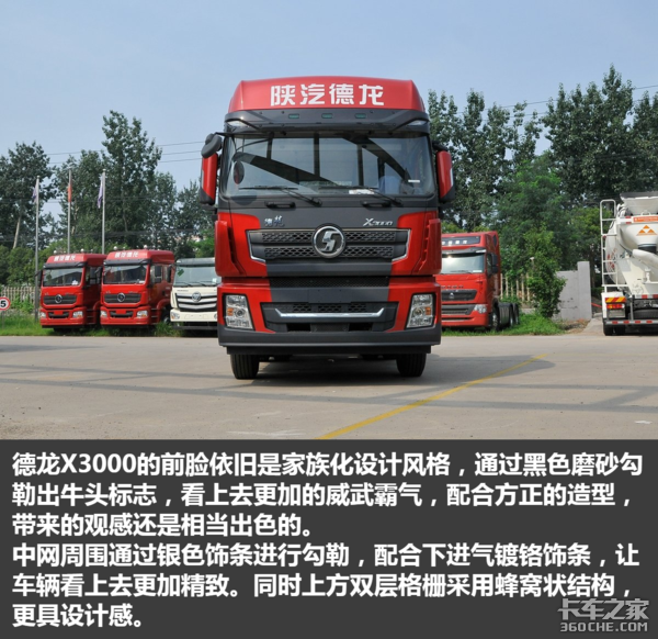 作为德龙旗下主力车型,德龙X3000的外观设计很有陕汽家族车型的影子,整体造型设计显得很敦实,给人一种很可靠的观感。