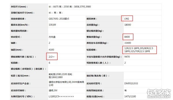 这款江淮K7 4x2燃气车整备质量8.4吨,提供12R22.5 18PR、295/80R22.5 18PR、315/70R22.5 18PR三种规格的轮胎。从轮胎规格上我们也不难看出,这款车更多的是针对高速公路运输场景。此外,该车还可以选装气囊悬架,更加高效的完成甩挂运输和挂车接驳。