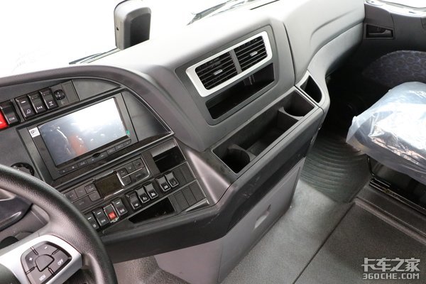 中控台区域配有多媒体液晶显示屏,支持中国重汽智能通系统,还有影音娱乐、随车Wifi、蓝牙、导航、故障诊断等功能;其下方带有自动恒温空调、节油开关、差速锁等功能按键,全方位的让驾驶员操作时省心更省力。侧边是空调出风口,还设计有两个水杯放置孔,最下面就是推拉式储物格,存放东西很方便!