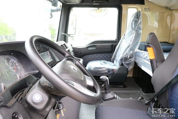 驾驶室内饰风格还是延续了此前的设计理念,布局简洁、沉稳内敛。深色配色说不上多好看,但胜在耐脏。虽然这款车驾驶室是平顶设计,但车内空间还算充裕,在接受的范围之内。