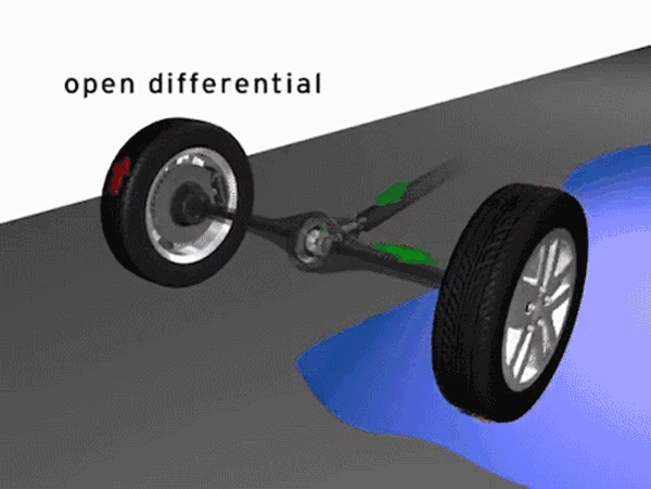 在此情况下,其中一侧轮胎因附着力较低,会产生严重的打滑情况,此时由于没有轮间差速锁,打滑一侧的车轮由于失去摩擦力,轮上扭矩会大幅度降低。由于差速器的“差速不差扭”的特性,也就是平均分配扭矩的特性,另一侧车轮,即便是附着力很好,由于轮上扭矩不足,即便你油门踩的再大,也不能产生足够的牵引力让车辆有效脱困。