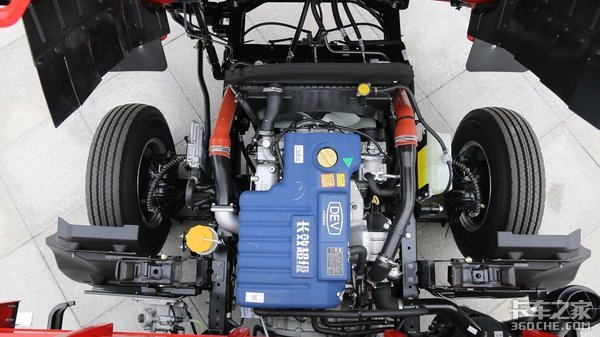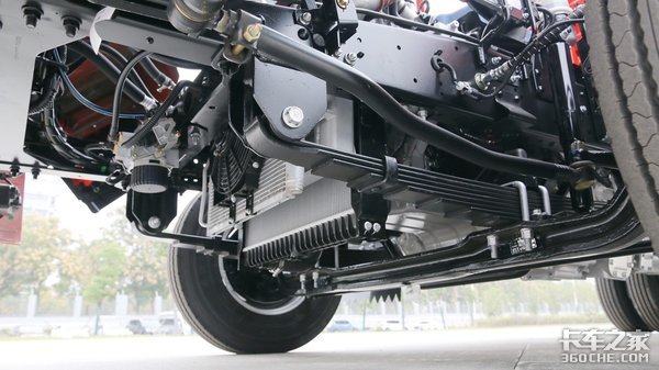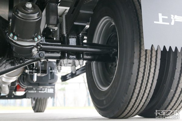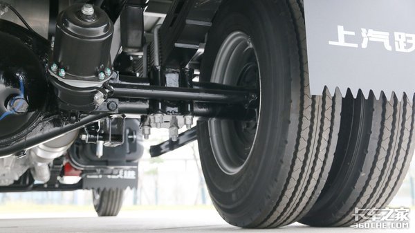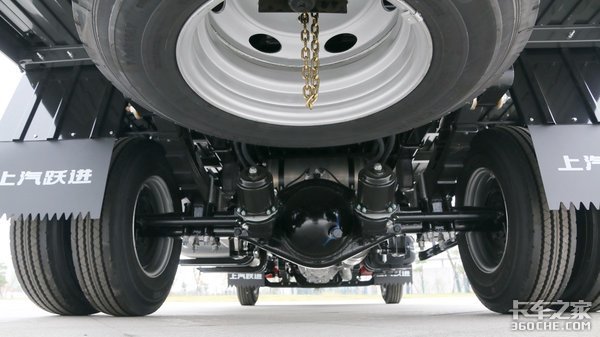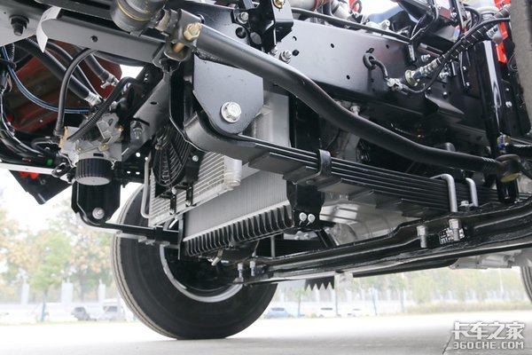 搭载的5吨级冲焊后桥,为一体式设计,在保证承载力的同时,也达到了降低自重的目的,桥壳使用的是高强钢,承载力更强。采用多片弹簧设计,前板簧片数为10片,后板簧为9+7片,使用倒摆臂吊耳,提升了车辆紧急转向时的稳定性。