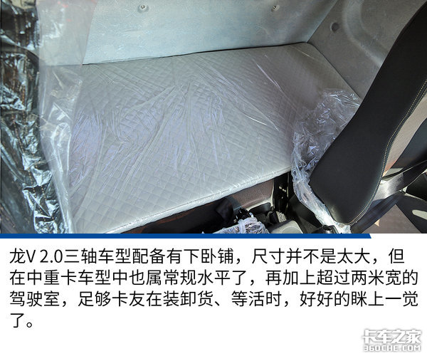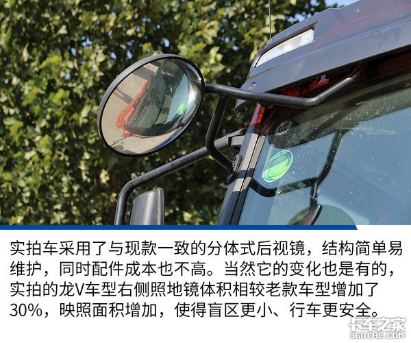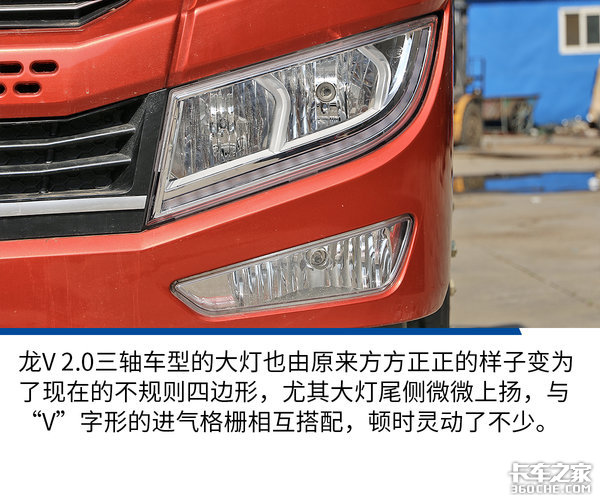 外观点评:龙V 2.0三轴车型在外观方面,由于有了“猛禽”的加持,整体更加时尚年轻化,会受到更多年轻一代卡友们的喜欢。同时遮阳板、照地镜和大灯的设计优化,也会让卡友在日常行车时更安全、更舒心。