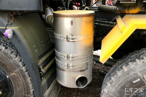 尾气后处理系统设置在了驾驶室的左侧后方,并设计成了柱状放置有效节约空间,里面采用了DPF+SCR的技术路线,满足国五排放以及广州当地严苛的排放标准。