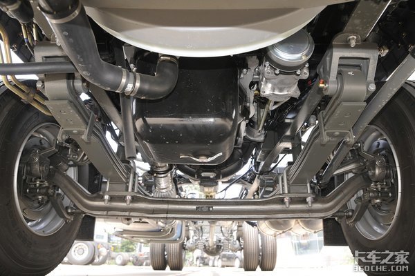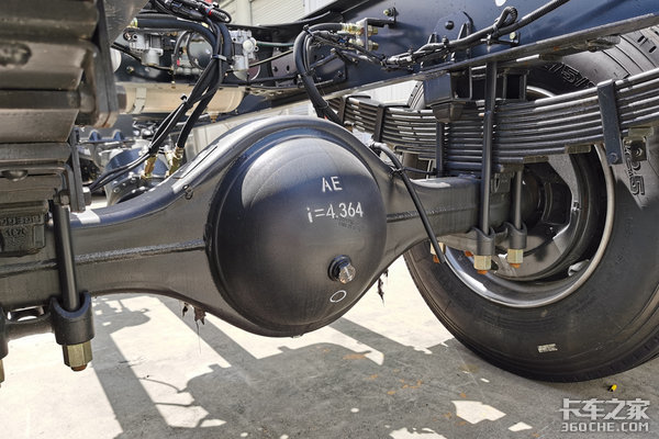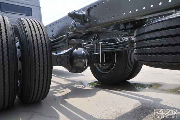 与发动机匹配是法士特的8JS95E 8挡手动变速箱,头挡速比为10.36,最高挡为超速挡,速比为0.79。配备11R22.5规格轮胎,前3后9片钢板悬架,采用高承载力轻量化的9吨级后桥,速比为4.33。
