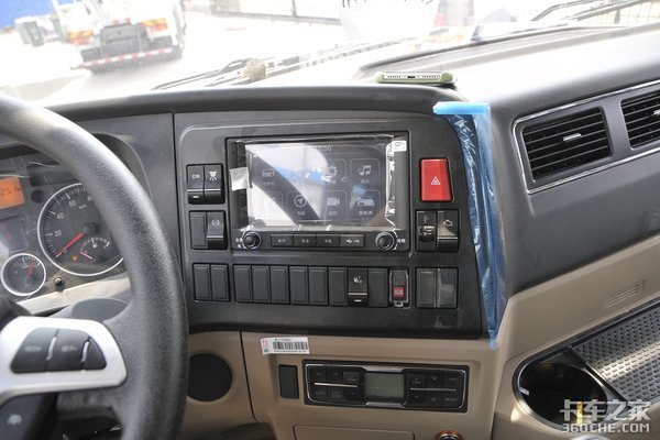 整个驾驶室内部采用了大量银色面板装饰,增加层次感,中控操作区域上方设有一个多媒体液晶屏,支持导航、蓝牙、行车记录仪、音乐以及视频等,下方则是收音机、空调、油箱加热等功能按键。