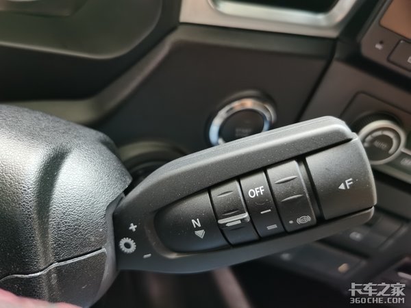 另外就是关于这个换挡的操作方式,只有空挡的指示,旋转拨片可以回到空挡的位置,和斯堪尼亚、奔驰的操作方式类似。在挡把顶部还有一个“F”功能按键,猜测应该是和前进挡、倒挡有关。