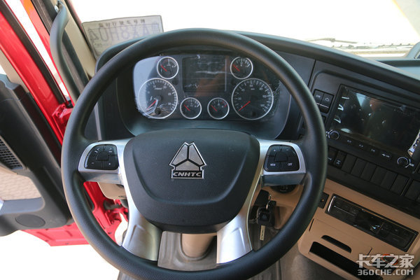 这款带有银色面板装饰的四辐式方向盘,就很有重汽味道,看着精致了不少。多功能按键支持蓝牙接听、多媒体控制、音量调节等。