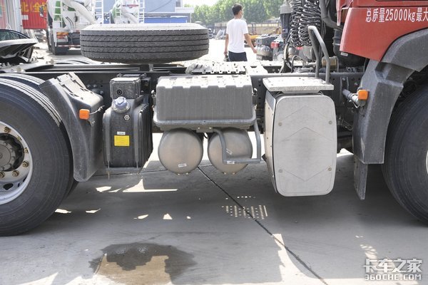 车辆右侧配备有尿素罐、储气筒、蓄电池、后处理系统,整个布局很紧凑。