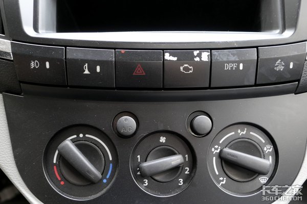储物格下方为车辆功能控制区,从左至右分别是前雾灯、电/气喇叭转换、双闪灯开启、发动机功能键、DPF再生按键以及高低挡切换,实际上高低挡切换功能有些类似于重卡上的动力模式以及经济模式切换。