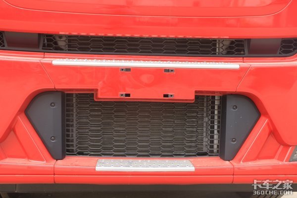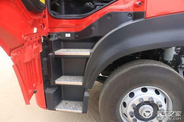 实拍车型采用了三层镂空式铝合金脚踏板设计,这种镂空设计的好处,除了具有很好的防滑效果,同时也可减少灰尘带入驾驶室内;但踏板最后一级有较高落差,卡友们上下车时需要注意。
