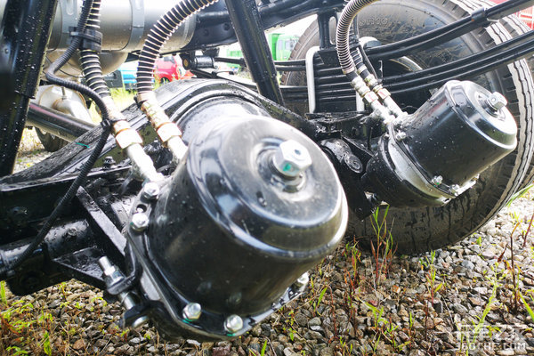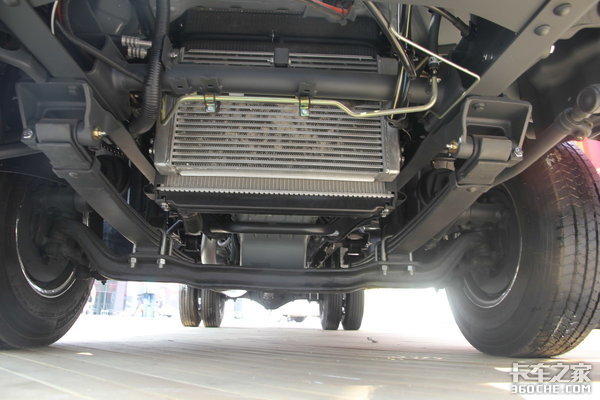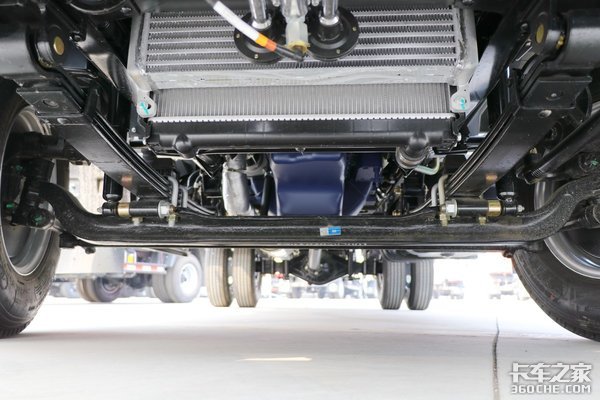 底盘部分,悬挂采用前3后3+2的少片簧设计来降低自重,前桥允许载荷是1610kg,后桥允许载荷是2885kg,速比为4.875。油箱容积在120L,外壳材质是铝合金,制动方式是前鼓后鼓。