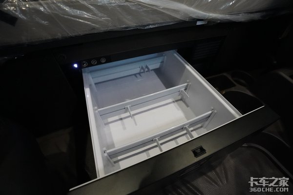 卧铺下方还有一个车载冰箱,温度可调范围在零下十度到零上十度之间,可以存放一些冰水冷饮,以及餐食,满足夏天行车时卡友们的实际需求。