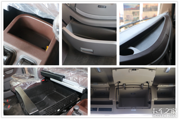 储物空间相对比较丰富,在驾驶室顶部、中控台、副驾驶以及卧铺底部,都有不同容积的储物盒,满足卡友们的置物需求。