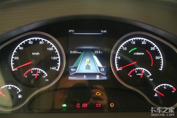 仪表盘采用的是数字+液晶屏的组合方式,左边表盘显示车速,右边表盘显示发动机转速,中间的彩色液晶屏除了可以查询到车辆基本信息、油耗、气筒气压等数据外,还可以显示车辆故障信息,并对驾驶员行车行为作出评价,方便驾驶员养成良好的行车习惯,提高燃油经济性。