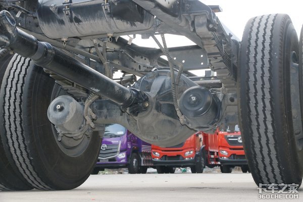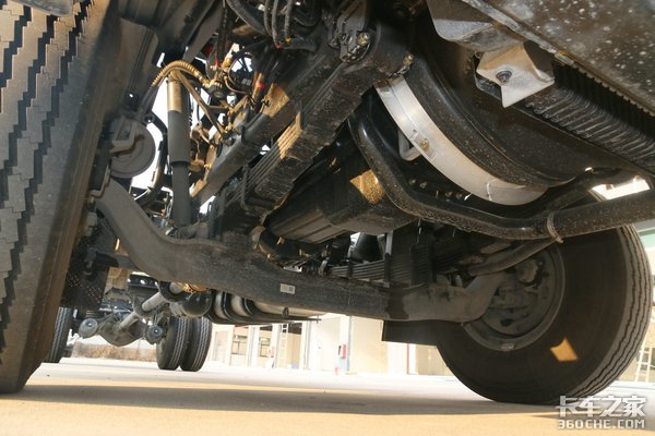 配备4.5吨前桥和9吨后桥,后桥速比4.33。前、后轴钢板悬架都是多片簧设计,保证了承载能力。