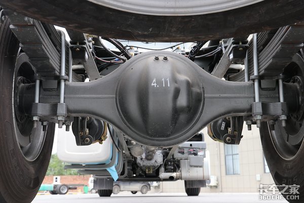 前桥为1094自调臂前轴,,后桥为MCJ11BG自调臂单后桥,前后均匹配匹配鼓式制动,后桥速比为4.11,这样的搭配在快递快运市场中出镜率比较高。