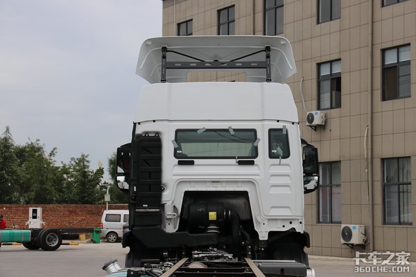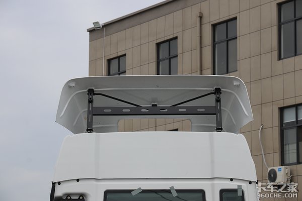 驾驶室顶部标配导流罩,而且导流罩高度可以调节,这样在搭配不同高度的货箱时,可以根据货厢的高度来调节导流罩的高度,降低行驶过程中的风阻,提高燃油经济性,但是需要爬到车顶调节,并不是很方便,也要提醒大家在调节时,一定要注意安全!