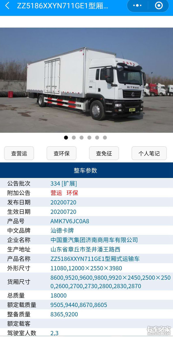 在查询这款车的公告时,我们发现匹配不同驾驶室的汕德卡G5可选择的货厢尺寸不同,最长可以达到9920mm,货厢尺寸最大为9920x2500x2870mm,计算得出货厢容积最大约71.176立方米,这样的货厢容积对于快递快运追求方量轻载质量的用户群体来说,非常可观。