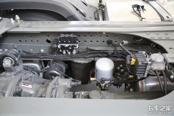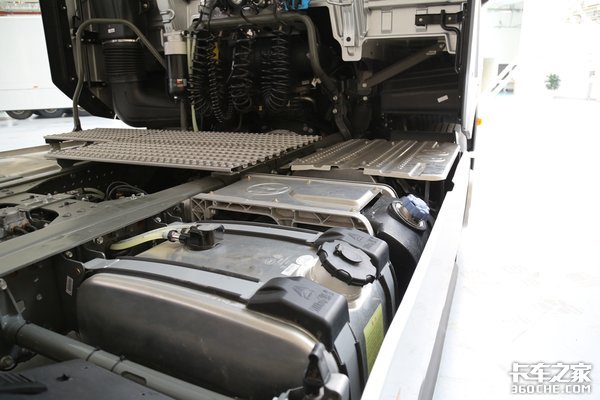 底盘细节方面还优化了一些小细节,包括各种支架与车架之间的连接,增加了一些垫片,可以降低因为抖动带来的支架断裂。还有就是整体的布局,实拍的车型左侧一个800L的铝合金邮箱,右侧是国六的后处理、尿素罐、220L的副油箱。储气罐都放在了车架内侧和尾部,蓄电池也放在了尾部,把底盘空间利用到了极致。