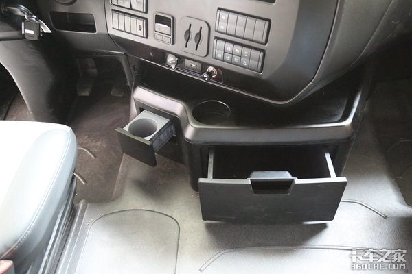 整个中控台向驾驶员一侧倾斜,方便驾驶员操作各种功能按键,做到真正的触手可及,大量使用翘板开关以后也便于驾驶员盲操作。中控台中间的位置设置了放置水杯的位置,另外还有一个小的储物格,这些都是为了驾乘人员放置一些票据、香烟之类的常用品。