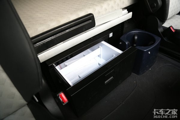 在卧铺下方还有冰箱,未来或将还会配饮水机之类的配置,这些也是为了提升驾乘人员的幸福感,在炎热的夏天有冰水喝,在寒冷的冬天有热水,不用再担心车上没有热水了。在副驾驶前方还有一个小桌板,方便记账或者是放点吃的在上面,不用纠结在车上吃饭到底是放在座椅上还是放在地板上。