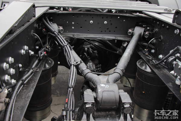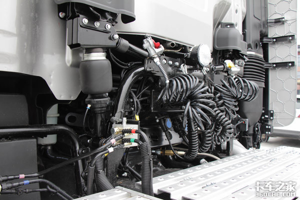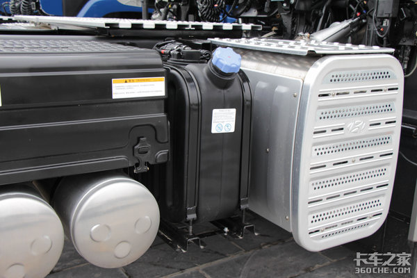 底盘右侧安装了后处理系统、尿素罐、电瓶、铝合金气瓶和干燥罐。