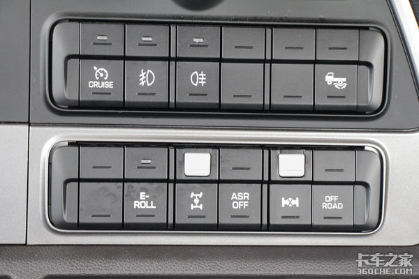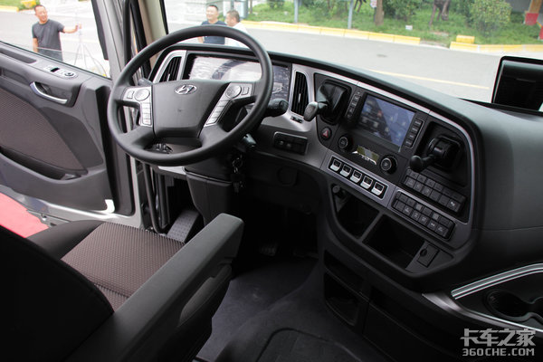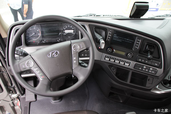 现代创虎的四幅式多功能方向盘的造型继承了现代乘用车的设计思路,手感非常的好,而且左右两边集成了功能齐全的多功能按钮。支持包括巡航、接打电话、音量、语音交互在内的丰富功能。另外,和乘用车一样,创虎的方向盘还可以起到吸能的作用,碰撞时可以转移一部分作用力来保证驾驶员的安全。