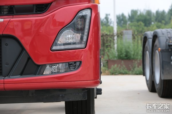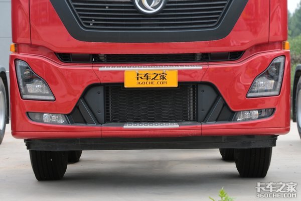 实拍车型是东风天龙KL 8×4 9米6载货车,在进气格栅以及保险杠处都进行了优化,线条比较流畅,导流罩顶部还配有示廓灯,细节处理比较到位。