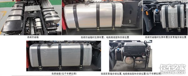 新款车型增加了空气悬架、双油箱等配置,还可以选装四方位摄像头、前方碰撞雷达等等,而且还还优化了电瓶、尿素罐的布置方式,可以选择普通的横置双电瓶,也可以选装纵置的双电瓶。而且气路的泵阀、ABS系统也都可以选装WABCO品牌的产品,整车可以说有了大升级。