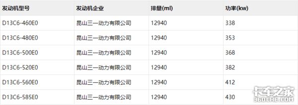 根据公示信息,新款车型搭载的是三一自主的三一道依茨D12和D13两种发动机,其中D13系列发动机最大可以输出585马力,并且满足国六排放标准,而D12最大输出是517马力,是国五标准。