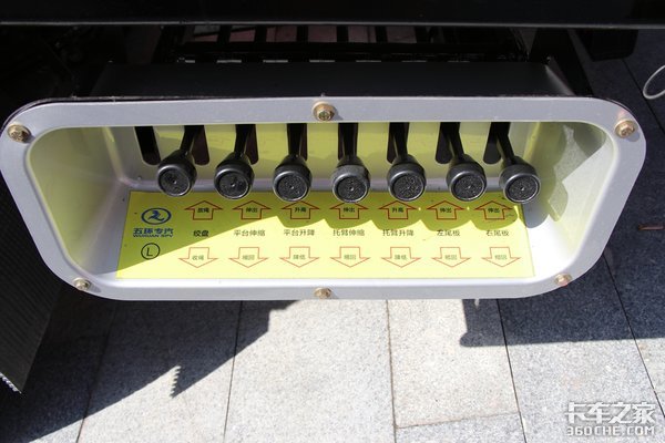 这是车辆上装的控制台,它可以控制平板面的伸缩以及斜角贴近地面。同时也是车尾托举装置的控制中心,控制托举装置的上下以及前后伸缩。
