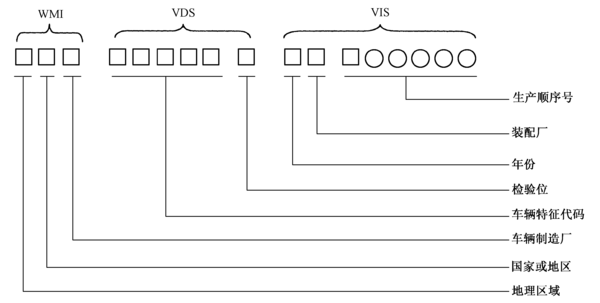 VIN码由世界制造厂识别代号(WMI)、车辆说明部分(VDS)、车辆指示部分(VIS)组成,共17位字码。