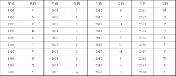 车辆指示部分(VIS)由8位字码组成,即VIN码的第十-第十七位。第十位为车辆生产年份,具体对照表见下表所示。
