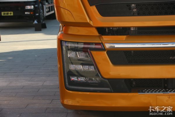 相比现款T7H,这款实拍的TH7外观造型还是有一些变化的。整体采用旭日金涂装,前脸依旧是“V”型设计,取消了中间“HOWO”字母标,在前脸的右侧增加了汉字标“豪沃”。黑色中网采用蜂窝式设计,配上条状镀铬装饰看上去更精致。