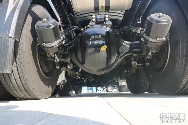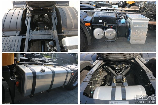在车辆自重上,实拍的这款车型采用了很多轻量化的设计,比如油箱、轮圈、储气筒等都采用了轻量化铝合金材质,还有底盘的少片簧的设计和车架上V型推力杆,同样降低了整车的自重。