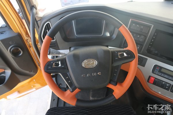 驾驶室采用高顶双卧驾驶室,内部的活动空间还算可以。内饰为灰色颜色搭配,多处可见有橘黄色装饰,对于驾驶员来说,这样的配色不会觉得视觉疲劳,也避免在驾驶时出现被压抑的感觉。